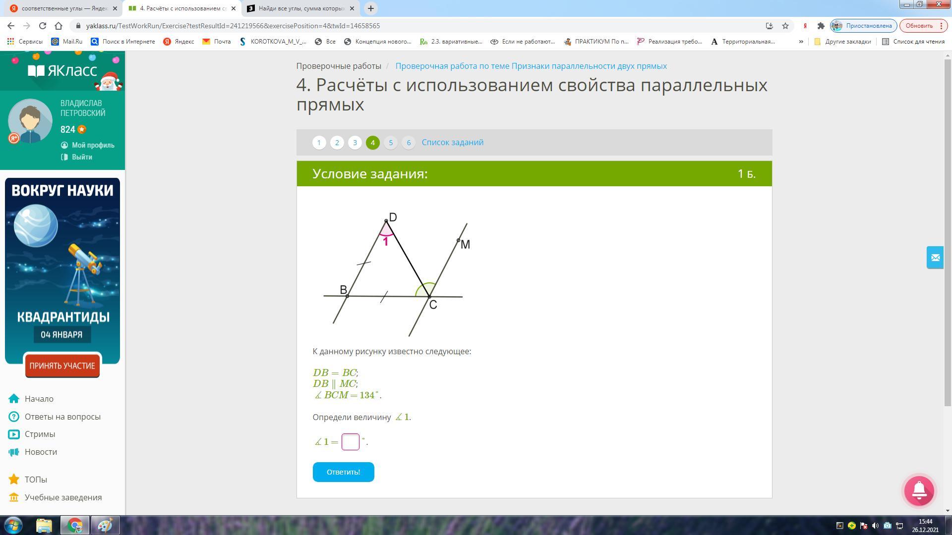 2) т.к. DB║MC при секущей ВC, то ∠DBC+∠ВСM=180°как сумма внутренних односторонних, тогда ∠В=180°-∠ВСM=180°-134°=46°
