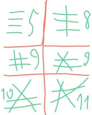 Там, где 4 прямых: 5, 8, 9, 10, или 11 частей, рисунок 3