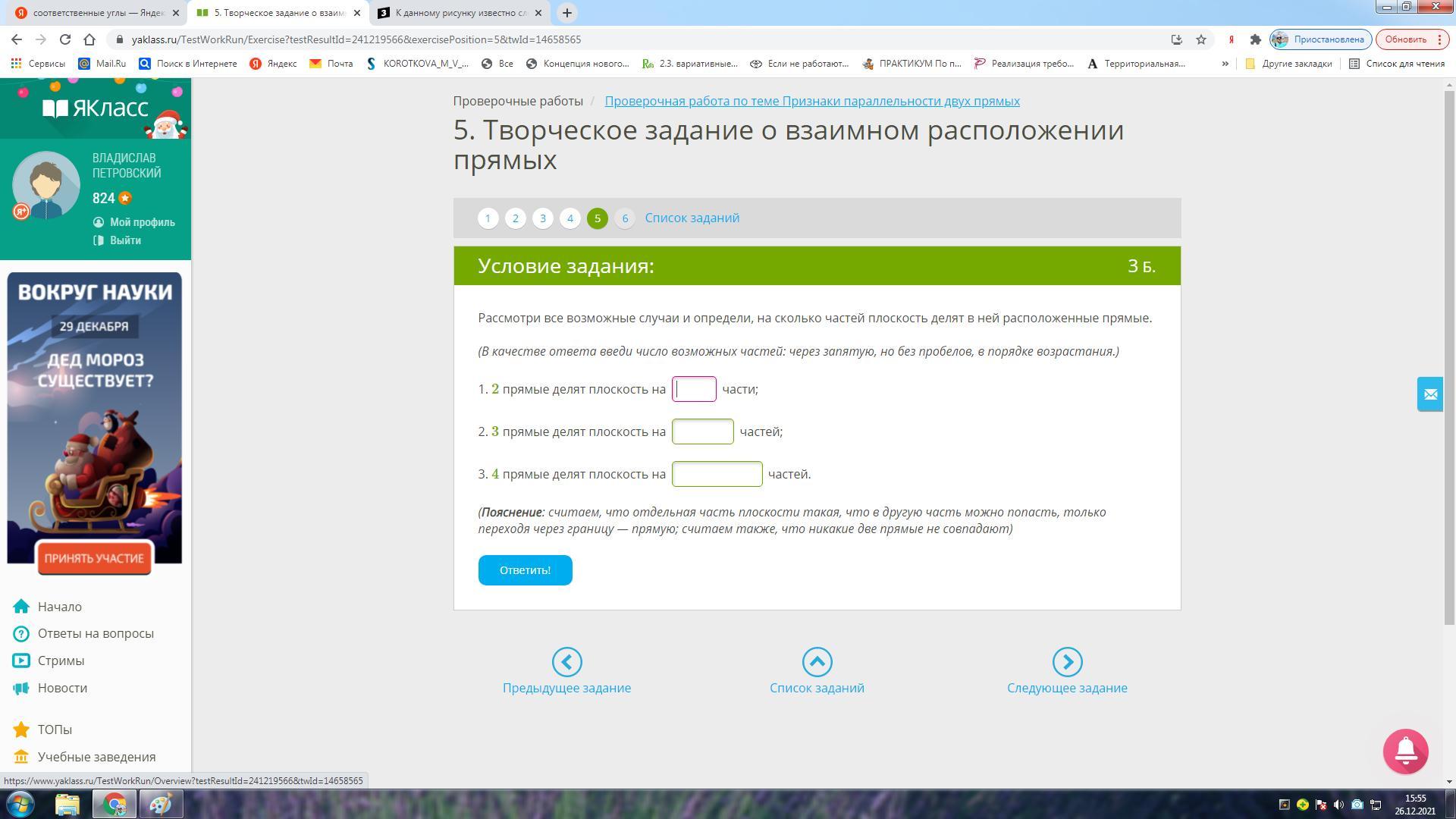 2. 3 прямые делят плоскость на 6 частей, если пересекаются в одной точке или две из них параллельны, а третья их пересекает ; если попарное пересечение и при этом никакие две не параллельны, то на 7 частей ; и на 4 части, при условии, что все эти прямые параллельны.