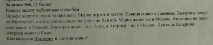 Виктория - Певица, т.к. Ангелина : " Не поёт", Мария - актриса, а Лунза не живёт в Лондоне, а в задаче сказано,что певица живёт в Лондоне.