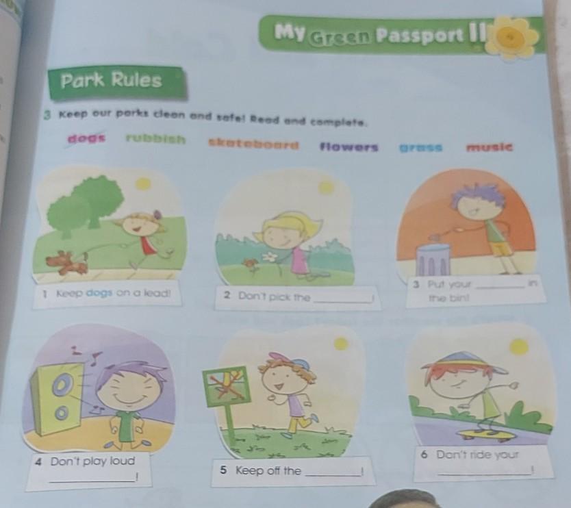 3 keep our parks clean and safe! Read and complete. dogs rubbish skateboard Flowers grass music 3 * in 1 Keep dogs on a lead! 2 Don't pick the 3 Put your the bin! G 22 6 Don't ride your 4 Don't play loud 5 Keep off the