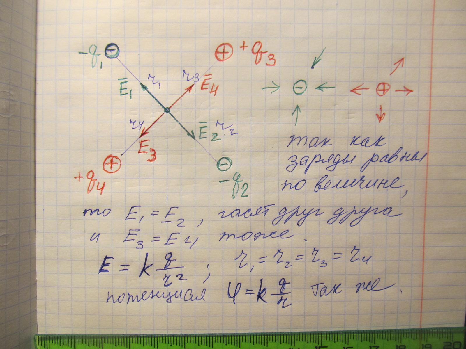 Как надо расположить два положительных и два отрицательных равных по величине заряда в вершинах квадрата, чтобы напряжённость и потенциал в центре квадрата были равны нулю?