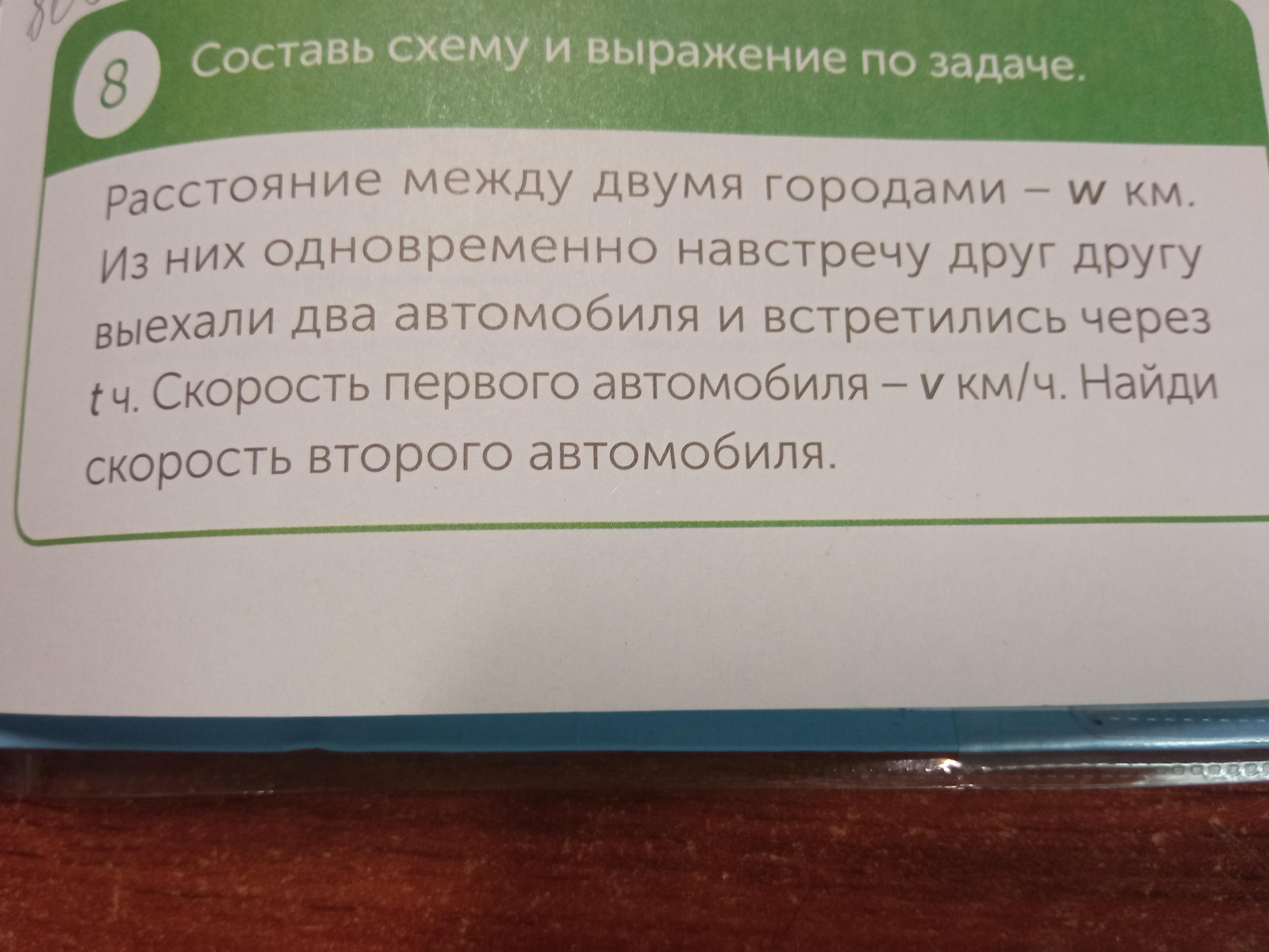Из них одновременно навстречу друг другу выехали два автомобиля и встретились через t ч. Скорость первого автомобиля-v км/ч.Найди скорость второго автомобиля.