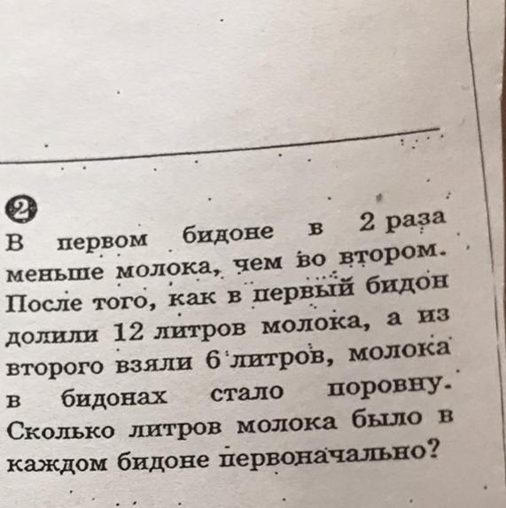 Ответ: в первом было 18 литров, во втором 18 * 2 = 36 литров.