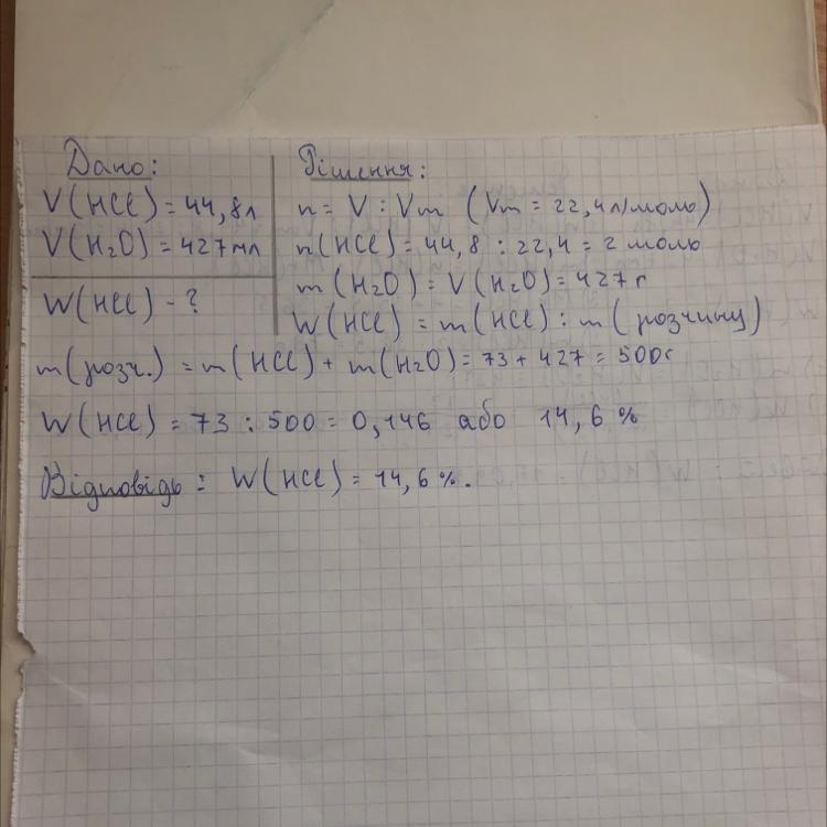 Обчисліть масову частку розчиненої речовини у хлоридній кислоті, виготовленій розчиненням гідроген хлориду (газ) об’ємом 44,8 л (н.у.) у воді об’ємом 427 мл.