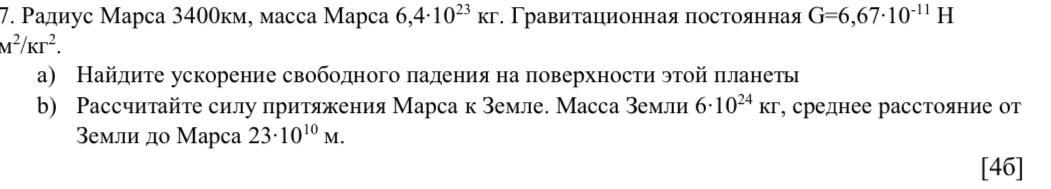 Радиус Марса 3400км, масса Марса 6,4∙1023 кг. Гравитационная постоянная G=6,67∙10-11 Н (дальше на фото)