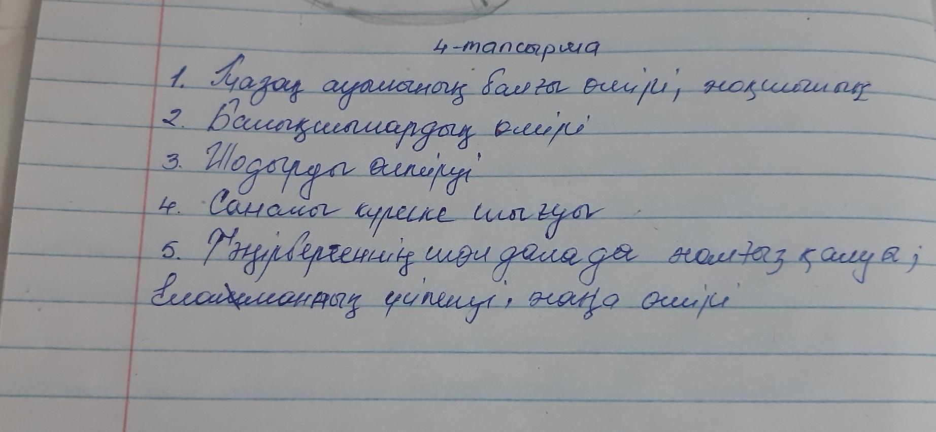 4-тапсырма. Үзінділерді негізге ала отырып, шығарманың композициялық құрылымын анықтаңдар. 1. Оқиғаның басталуы: 2. Дамуы: 3. Шиеленісуі: 5. Шарықтау шегі: 6. Шешімі