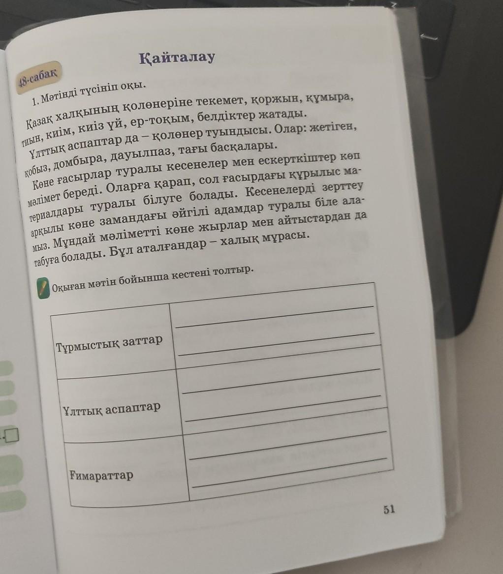 Ұлттық аспаптар:жетіген,қобыз,домбыра,дауылпаз тағы басқалары.
