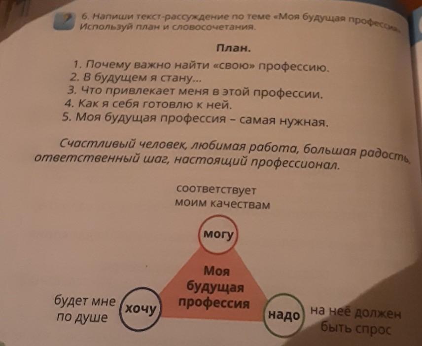 6. Напиши текст-рассуждение по теме «Моя будущая професор Используй план и словосочетания. План. 1. Почему важно найти «свою» профессию. 2. В будущем я стану... 3. Что привлекает меня в этой профессии. 4. Как я себя готовлю к ней. 5. Моя будущая профессия – самая нужная. Счастливый человек, любимая работа, большая радост ответственный шаг, настоящий профессионал. соответствует моим качествам могу Моя будущая профессия будет мне (хочу надо на неё должен быть спрос по душе
