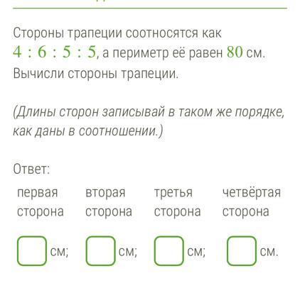 Стороны трапеции соотносятся как 4:6:5:5, а периметр её равен 80 см.