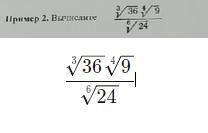 \displaystyle \frac{\sqrt[3]{36}\sqrt[4]{9}  }{\sqrt[6]{24} }=\frac{\sqrt[12]{36^4}\sqrt[12]{9^3}  }{\sqrt[6]{24} }=\frac{\sqrt[12]{36^4*9^3} }{\sqrt[6]{24} }=\frac{\sqrt[12]{36*324^3} }{\sqrt[6]{24} }=\frac{\sqrt[12]{36*324^3} }{\sqrt[6]{24} }*\frac{\sqrt[6]{24^5} }{\sqrt[6]{24^5} }=\\ \\ \\ \frac{\sqrt[12]{36*324^3}\sqrt[6]{24^5}  }{\sqrt[6]{24}\sqrt[6]{24^5}  }=\frac{\sqrt[12]{36*324^3}\sqrt[12]{24^1^0}  }{\sqrt[6]{24*24^5} }=\frac{\sqrt[12]{36*324^3*24^1^0} }{24}=3\sqrt[6]{2}