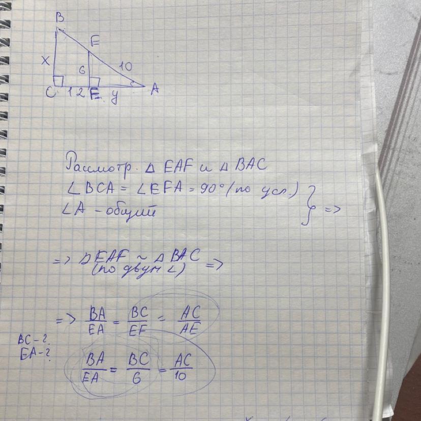 ВС/FE=AC/AE ⇒ x/6= (12+y)/y. Δ АЕF по условию прямоугольный. Тогда по теореме Пифагора у=√100-36=√64=8=АЕ, а АС=12+8=20.