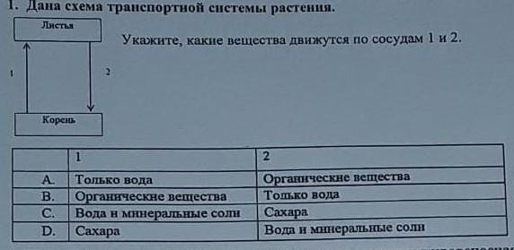 1. Дана схема транспортной системы растения. Укажите, какие вещества движутся по сосудам 1 и 2. 1 2 Корсна 19 2 Органические вещества Только вода Толко вода В. Органические вещества Сıxapa Вода и минеральные солн