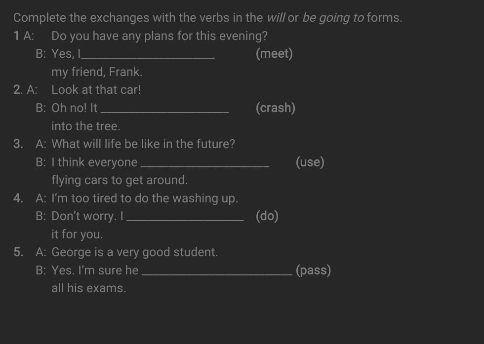 СРОЧНО ПРОШУУУУ СРОЧНО НАДОО Complete the exchanges with the verbs in the will or be going to forms. 1 A: Do you I have any plans for this evening? (meet) B: Yes, I my friend, Frank. 2. A: Look at that car! B: Oh no! It into the tree. (crash) 3. A: What will life be like in the future? B: I think everyone flying cars to get around. (use) 4. A: I'm too tired to do the washing up. B: Don't worry. I it for you. (do) 5. A: George is a very good student. B: Yes. I'm sure he all his exams. (pass)