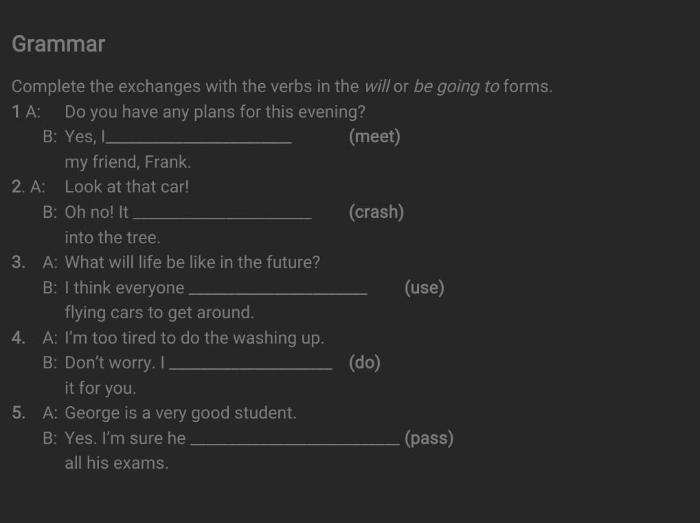 Complete the exchanges with the verbs in the will or be going to forms.
