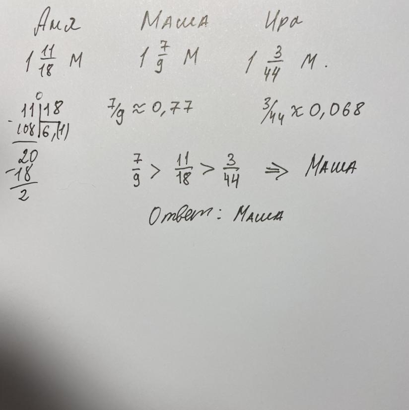 на уроке физкультуры Аня прыгнула на 1 11/18 м. Маша прыгнула на 1 7/9 м. а Ира прыгнула 1 3/44.Кто из них прыгнул дальше