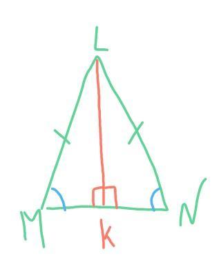 LK - высота, она образует с основанием два равных прямых угла (/LKM=/LKN=90°)