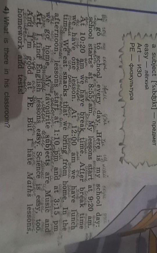 они идут в школу каждый день, Вот мой школьный день: начало занятий * в 8:55. Мои уроки начинаются в 9:20 утра. В 10:20 у нас перерыв. После перерыва у нас одно занятие. В 12:00 по времени после обеда, уроки начинаются в 1:10, мы обедаем, перекусываем, что приносим из дома. Любимые предметы после полудня и в 15:15 - Музыка, и мы идем домой. Искусство. Я нахожу уроки английского легко. Наука тоже проста. Я хорошо разбираюсь в физкультуре. Но я ненавижу уроки математики, домашние задания и тесты!