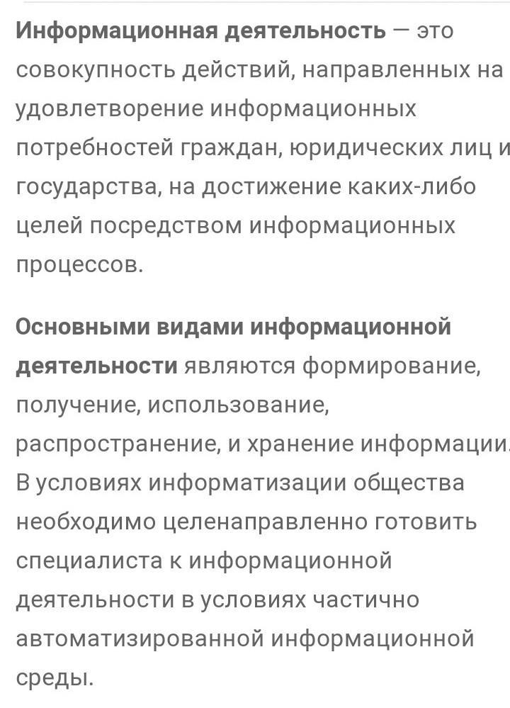 Ответ:Основными видами информационной деятельности являются формирование, получение, использование, распространение, и хранение информации. В условиях информатизации общества необходимо целенаправленно готовить специалиста к информационной деятельности в условиях частично автоматизированной информационной среды.