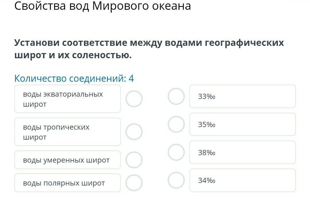Установи соответствие между водами географических широт и их соленостью.