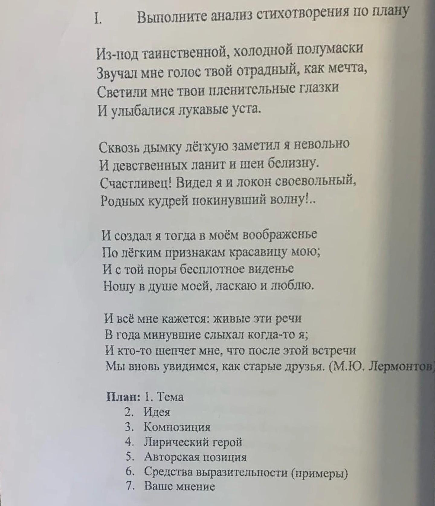Тема стихотворения – влюблённость в таинственную красавицу. Композиция – Стихотворение состоит из четырёх строф, условно делится на смысловые части: портрет встреченной на балу таинственной красавицы, мечта лирического героя о созданном в его воображении видении. Жанр – элегия.