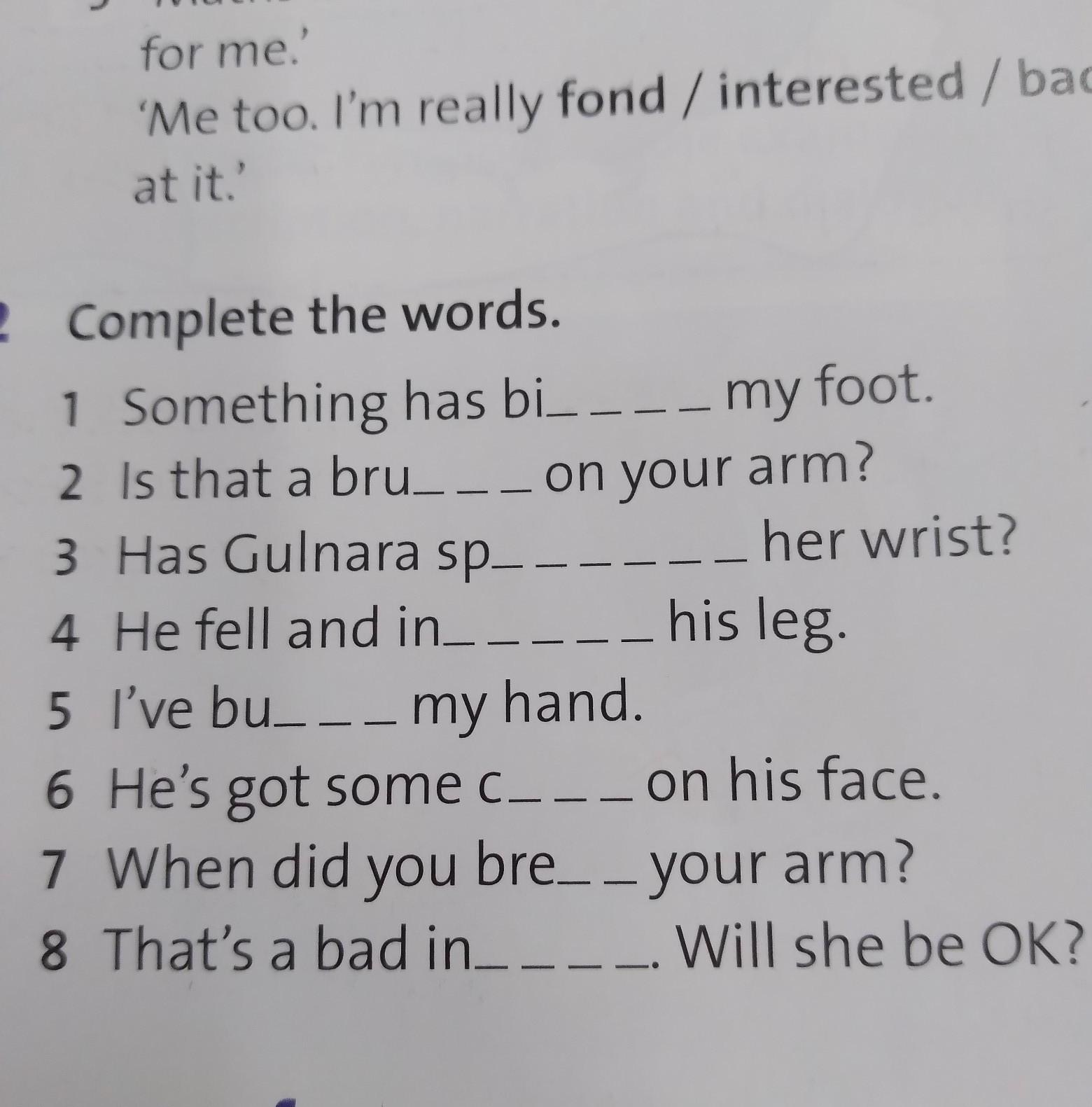 2 Complete the words. 1 Something has bi___ my foot. 2 Is that a bru___ on your arm? 3 Has Gulnara sp her wrist? 4 He fell and in 5 I've bu... -- my hand 6 He's got some c... on his face. 7 When did you bre_ - your arm? 8 That's a bad in Will she be OK? his leg