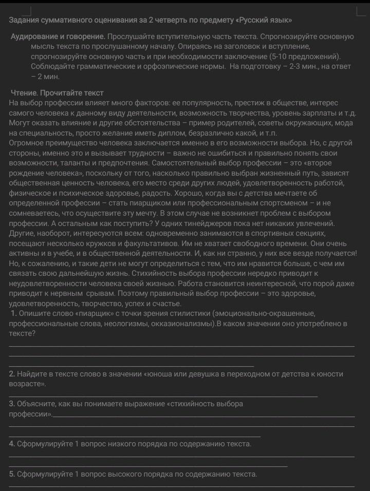 Опишите слово «пиарщик» с точки зрения стилистики (эмоционально-окрашенные, профессиональные слова, неологизмы, окказионализмы).В каком значении оно употреблено в тексте? 2. Найдите в тексте слово в значении «юноша или девушка в переходном от детства к юности возрасте». 3. Объясните, как вы понимаете выражение «стихийность выбора профессии». 4. Сформулируйте 1 вопрос низкого порядка по содержанию текста. 5. Сформулируйте 1 вопрос высокого порядка по содержанию текста. помогите пожалуйста срочно