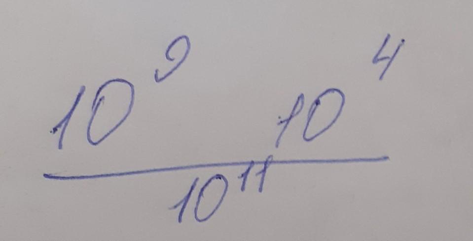 \frac{10^9*10^4}{10^{11}}= \frac{10^{9+4}}{10^{11}} =\frac{10^{13}}{10^{11}} =10^{13-11}=10^2=100.