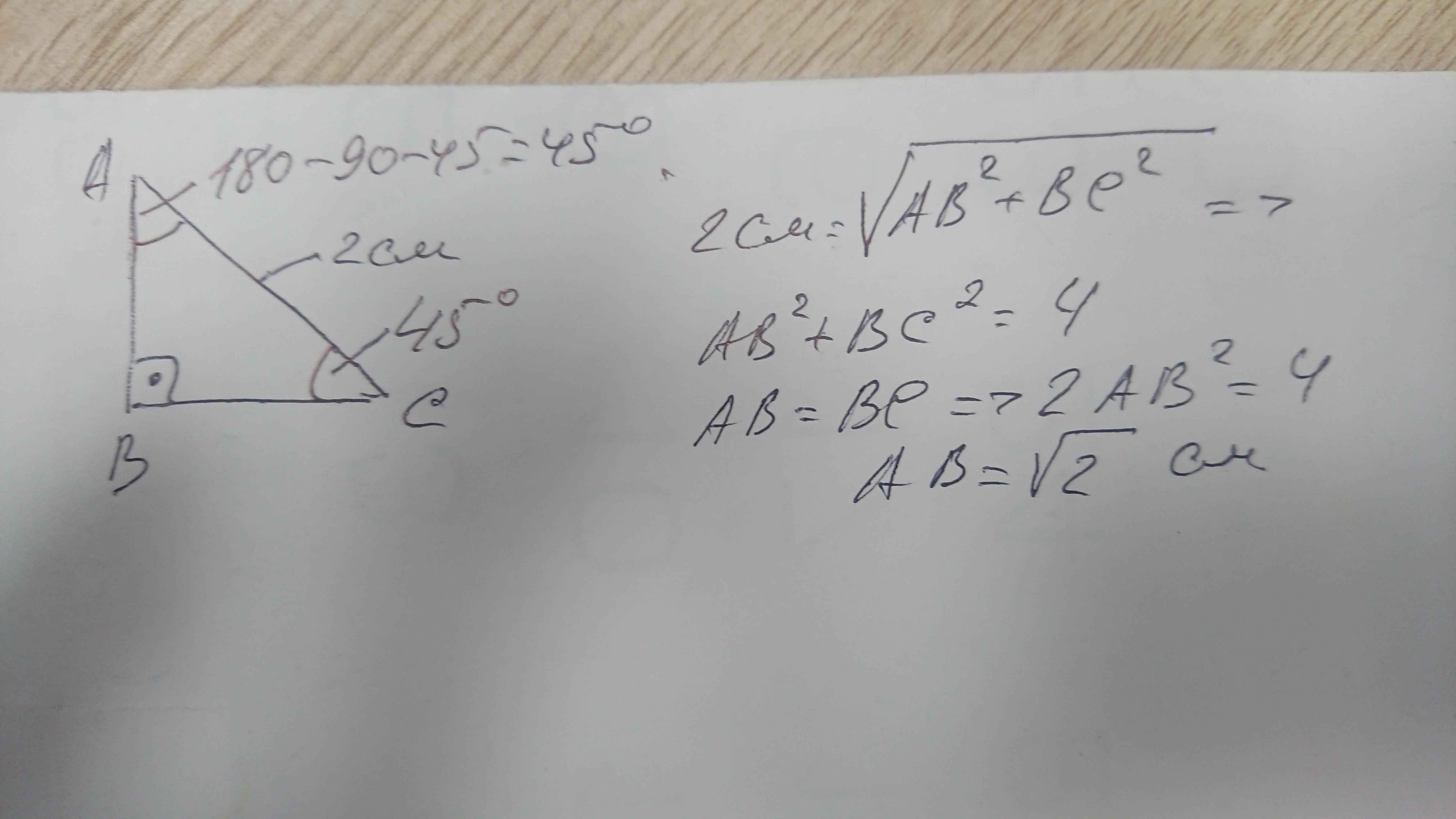 найти катеты прямоугольного треугольника, если гипотенуза равна 2 см, а один из углов 45 градусов .помогиттте