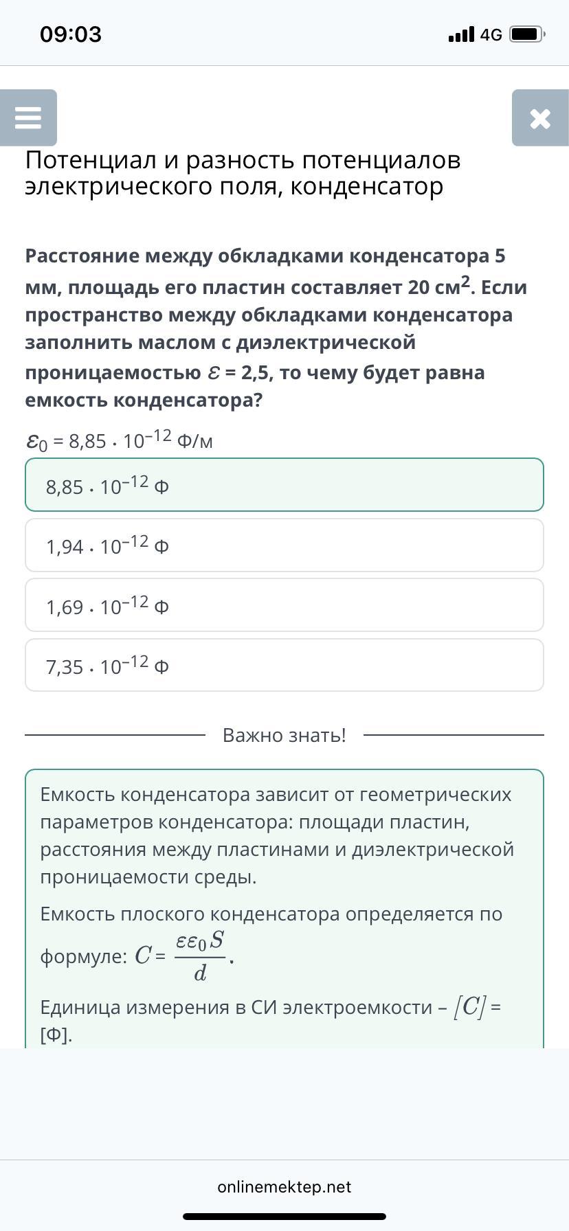расстояние между обкладками конденсатора 5 мм, площадь его пластин составляет 20 см². если пространство между обкладками конденсатора заполнить маслом с диэлектрической проницаемостью Е=2,5 , то чему будет равна емкость конденсатора?