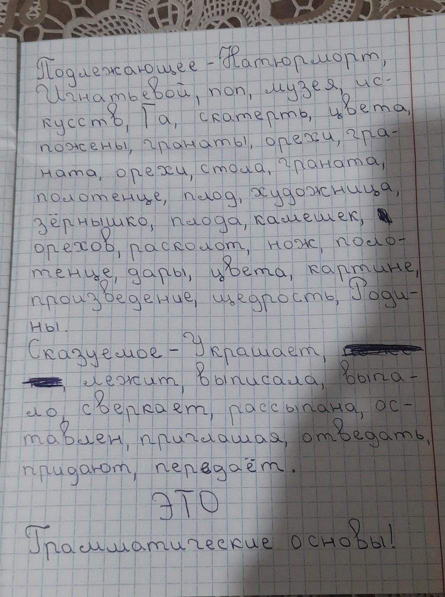 Натюрморт странатами художни цы Игнатьевой украшает один из за non Кыргызского национального музея изобразительных искусств имени Га. пара Айтиева, на столе, п.крытом скатерт...10 красного цвета, живописно ра...no- пожены гранаты и орехи. В пл...теной корзине - пять крупных цепых пло- до граната, а рядом в обыч, ном чуть синеватом" целлофановом про- зрач...ном пакете - грецкие орехи, но очищенные от скорлупы, Дилфируз Игнат.ua, в самом центре стола на алом Граната на красном тр...пичном полотенце на блодце ле- жит уже разрезанный зернистый плод. Художница лобовно выписала каждое зернышко! А одно из них будто случайно выпало из ячейки плода и сверкает, словно драгоценный камешек. Справа от блюдца рассыпана горст... орохов, один расколот и опустошён, Серебряный столовый нож оставлен тут же на полотенце, как бы приглашая нас отведать аппетитные дары осени Гармоничные и мягкие цвета - от красно-розового до бледно-синего придают картине сказоч...ную т... инственность, это чудес,,ное произведе ние искусства передаёт щедрость и изобилие моей родины.