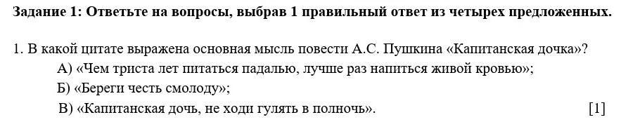 Задание 1: Ответьте на вопросы, выбрав 1 правильный ответ из четырех предложенных. 1. В какой цитате выражена основная мысль повести А.С. Пушкина «Капитанская дочка»? А) «Чем триста лет питаться падалью, лучше раз напиться живой кровью»; Б) «Береги честь смолоду»; В) «Капитанская дочь, не ходи гулять в полночь». [1]