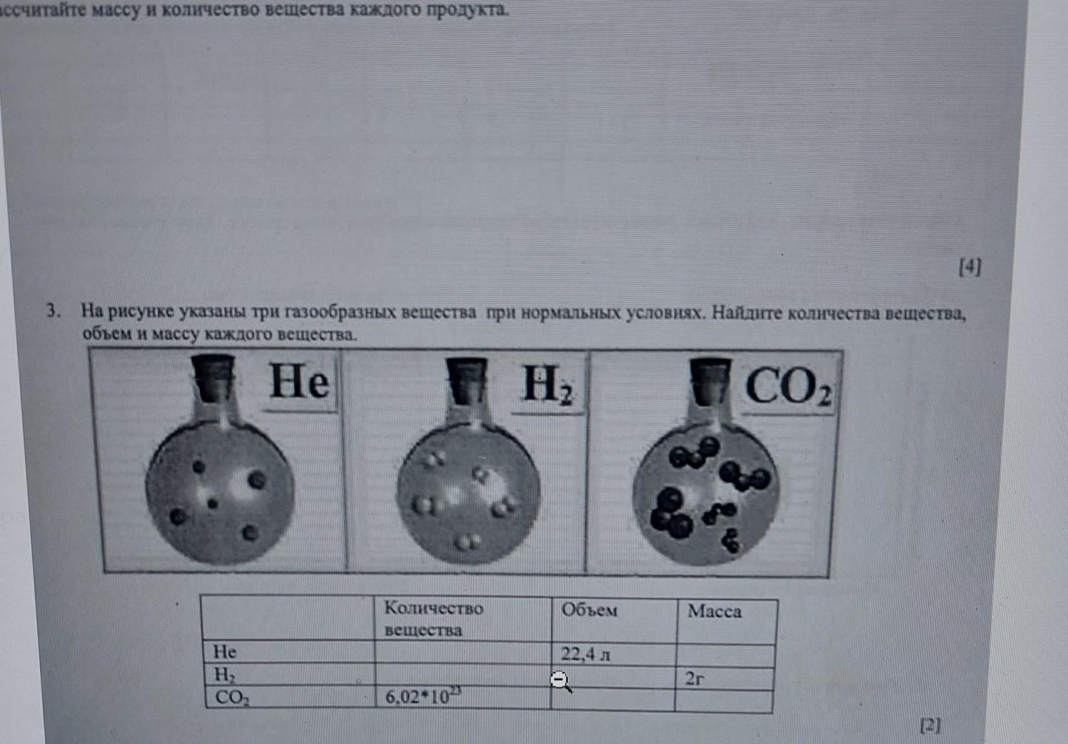 3. На рисунке указаны три газообразных вещества при нормальных условиях. Найдите количества вещества, объем и массу каждого вещества. Не Н, СО, Объем Количество вещества Macca He 22,4 A Н. 2г CO. 6,02010 2)