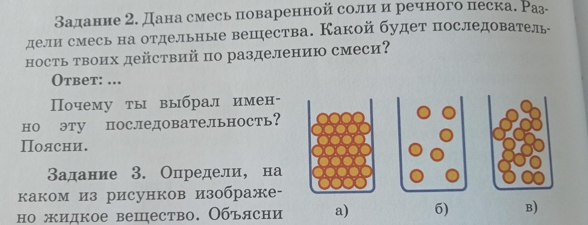 Задание 2. Дана смесь поваренной соли и речного песка. Раз- дели смесь на отдельные вещества. Какой будет последователь- ность твоих действий по разделению смеси? Ответ: ... Почему ты выбрал имен- Эту последовательность? Поясни. ЗАДАНИЯ 2!!!!