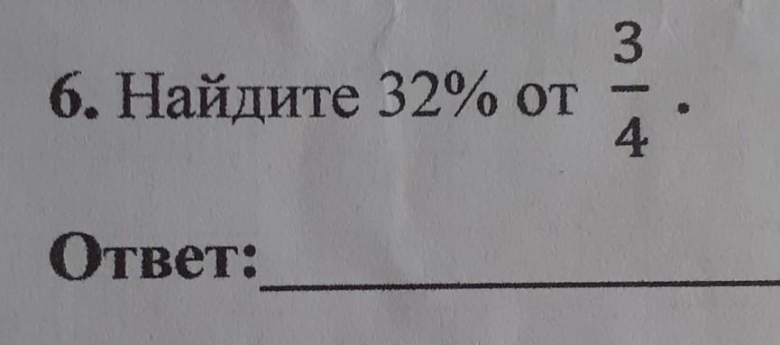 32\% = x \\ 100\% =  \frac{3}{4}  \\  \\ x =  \frac{3}{4}  \times 32 \div 100 \\ x =  \frac{24}{100 }  =  \frac{6}{25}  = 0.24