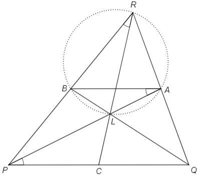 Задание №4. В треугольнике PQR точка L пересечение медиан PA и QВ. Окружность, описанная около треугольника RAB, проходит через точку L. Найдите Длину медианы, проведённой из вершины R, если PQ =18.