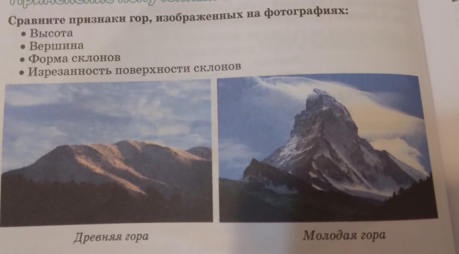 Сравните признаки гор, изображенных на фотографиях: • Высота • Вершина • Форма склонов • Изрезанность поверхности склонов . Древняя гора .Молодая гора
