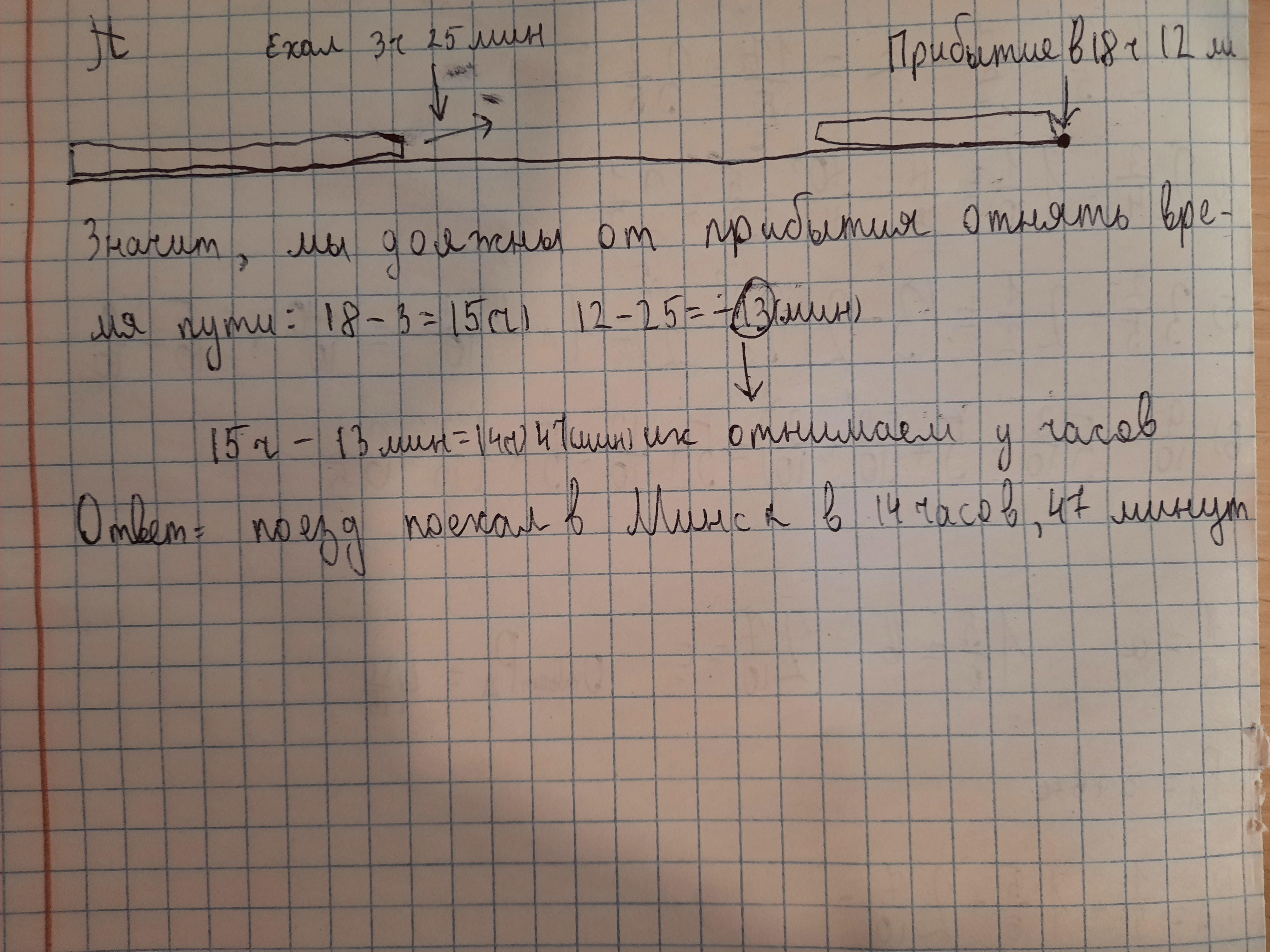 Чтобы найти время отбытия, нужно от времени прибытия отнять время, проведенное в пути в пути.