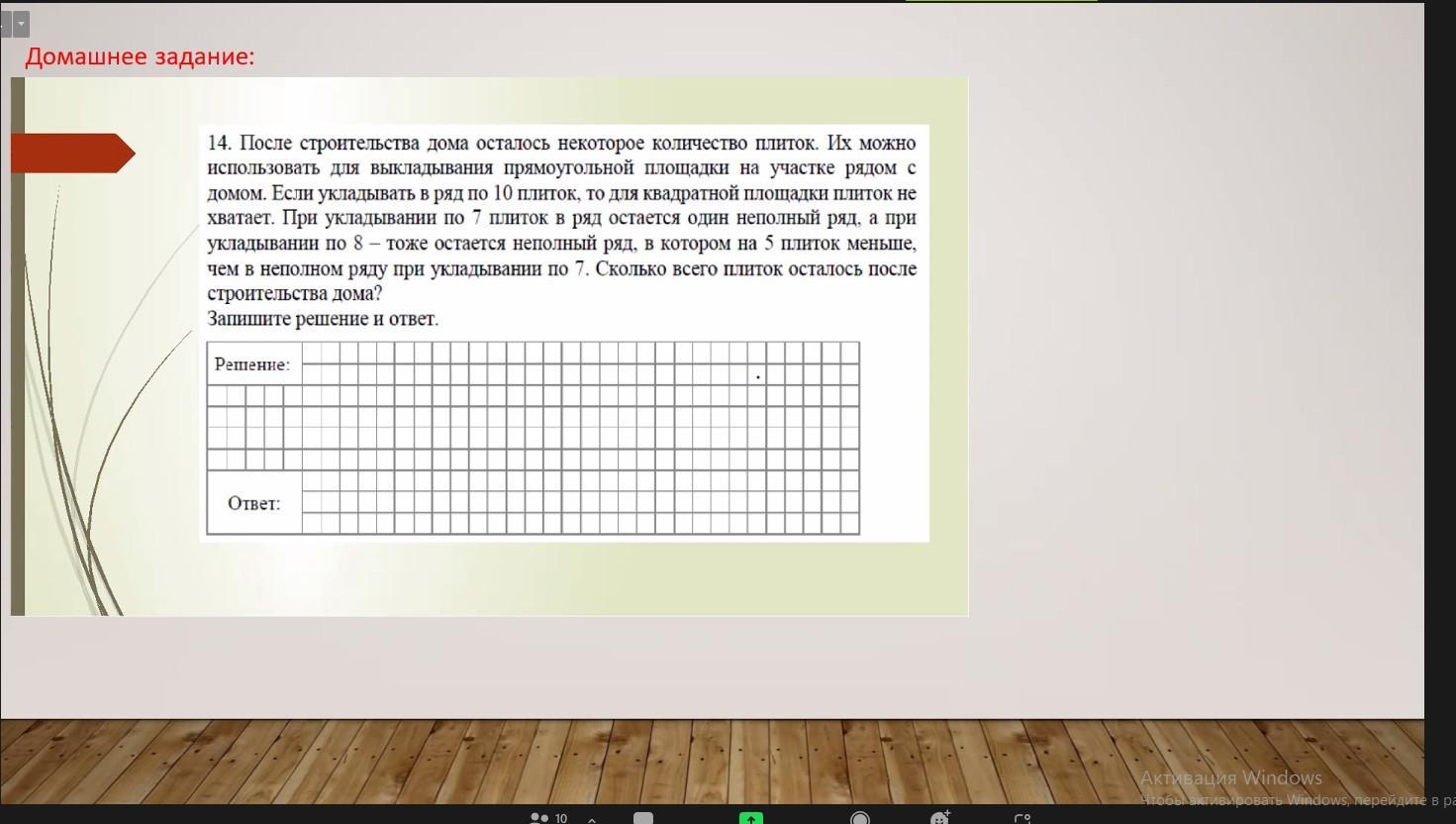 1. При укладке по 7 плиток в ряд, один ряд остаётся незаконченным