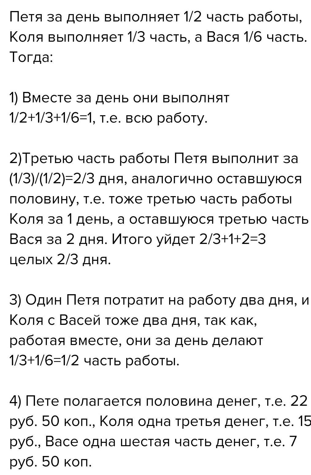 Коля выполняет работу за 2 дня. Эту же работу Петя выполняет за 3 дня, а Вася за 6 дней. Если Коля выполняет 1/3 часть работы, а Петя половины остальной работы. Остальных работ выполняет Вася. За сколько времени выполняют работу?