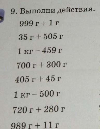 9 Выполни действия 999 г + 1 г 35 г + 505 кг 1 кг - 459 г 700 г + 300 г 405 г + 45 г 1 кг - 500 кг 720 г + 280 г 989 г + 11 г третий класс математика