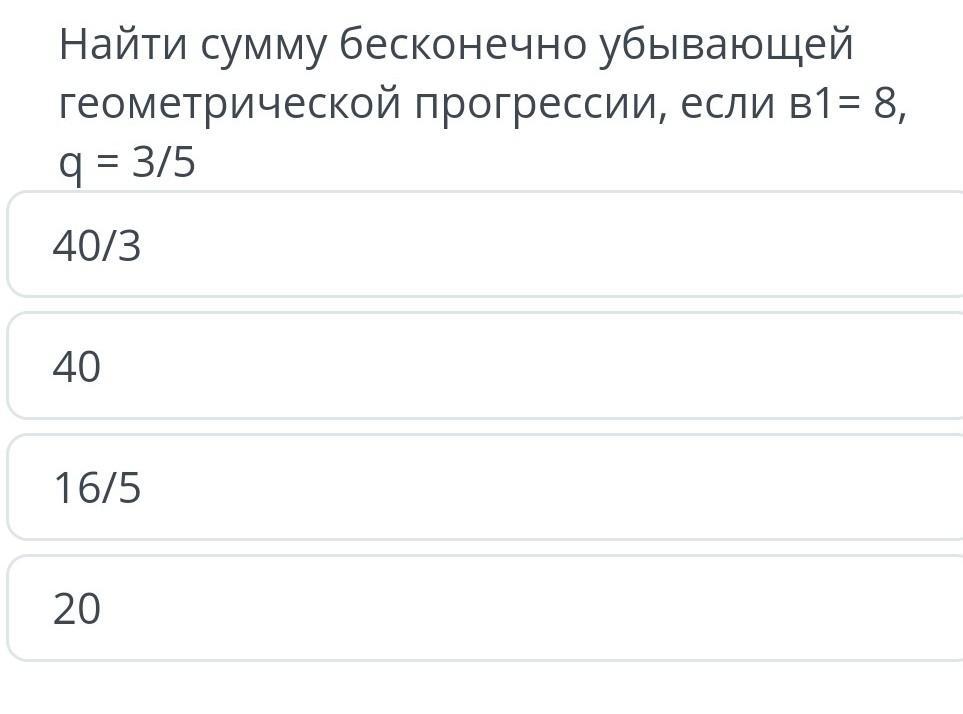 найти сумму бесконечно убывающей прогрессии, если b1=8, q=3/5​
