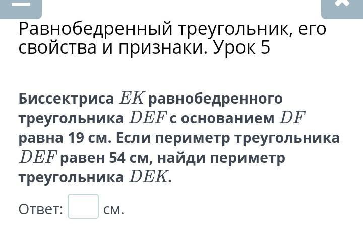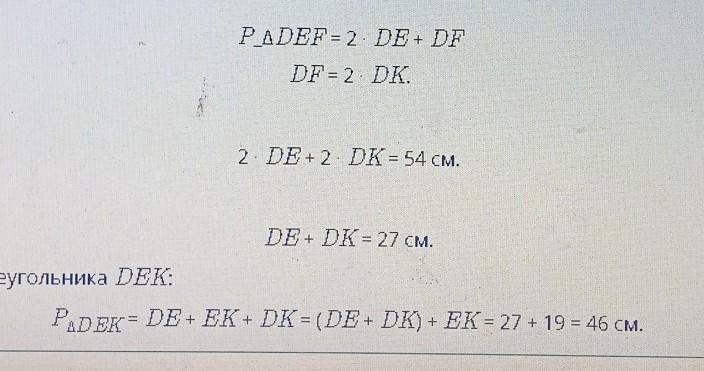 Биссектриса EK равнобедренного треугольника DEF с основанием DF равна 19 см. Если периметр треугольника DEF равен 54 см, найди периметр треугольника DEK. Ответ: см.
