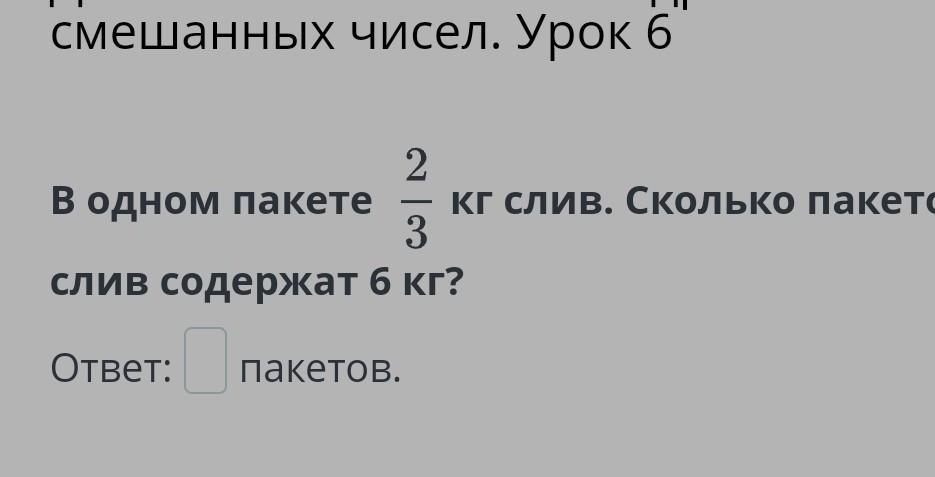 В одном пакете 2/3 кг слив. Сколько пакетов слив содержат 6 кг? Ответ: