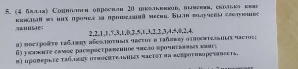 5. (4 балла) Социологи опросили 20 школьников, выясняя, сколько книг каждый из них прочел за прошедший месяц. Были получены следующие данные: 2,2,1,1,7,3, .