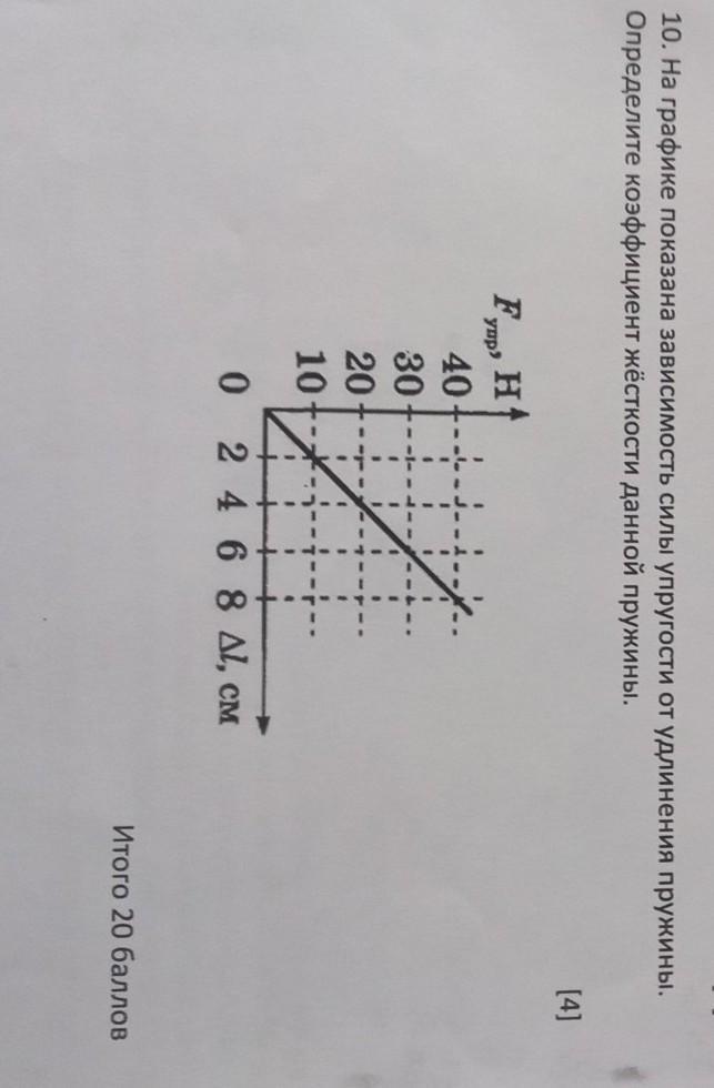 10. На графике показана зависимость силы упругости от удлинения пружины. Определите коэффициент жёсткости данной пружины. [4] Fup, ні H 40 30 20 10 0 2 4 6 8 А, см