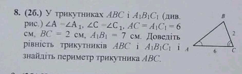 Так як ∠А=∠А1, ∠С=∠С1 та АС=А1С1 то за другою ознакою ΔАВС=ΔА1В1С1