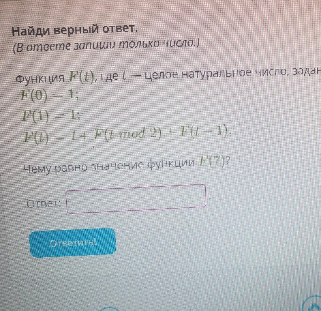 Найди верный ответ. (В ответе запиши только число.) му Функция F(t), где t целое натуральное число, задана следующим соотношением: F(0) = 1; F(1) = 1; ; F(t) = 1+ F(t mod 2) + F(t — 1). Чему равно значение функции F(7)? Ответ: Ответить!