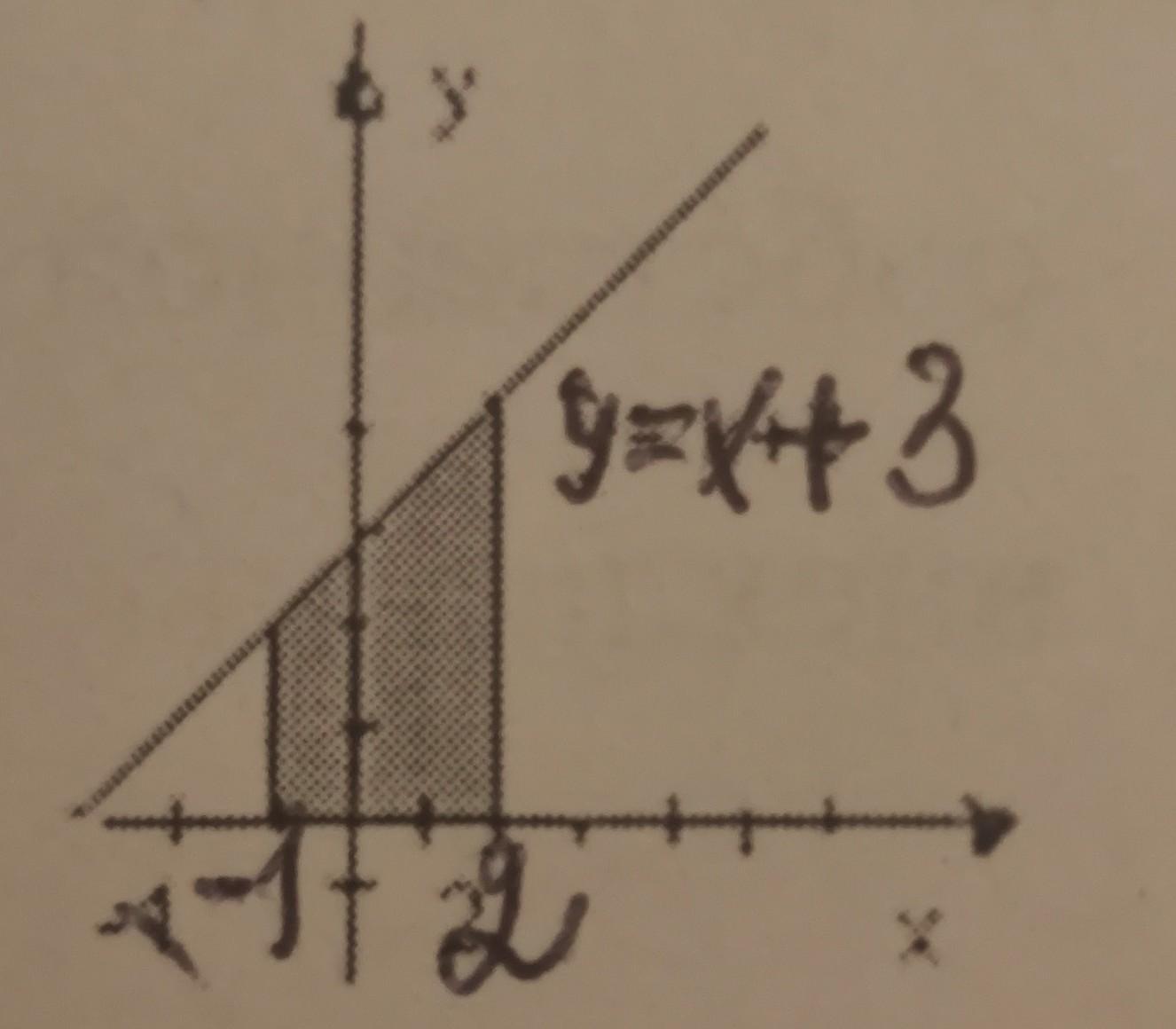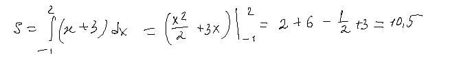Пошаговое объяснение:интеграл от а до в =F(x)lот а до в ,т.е S=F(b)-F(a)=(x в квадрате делённого на 2 + 3х)lот -1 до 2 =(2 в квадр. делён на 2+3*2)-(-1 в квадр. делённый на 2 +3*(-1))=(2+6)-(1/2-3)=8+2,5=10,5 кв. ед.