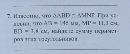 известно треугольника ABD= MNP условии что AB=145мм,MP=11,3см,BD=3,8см,найдите сумму периметров этих треугольников